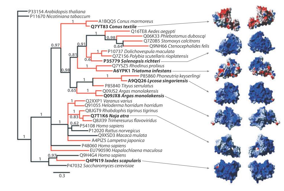 Questo albero vi mostra la presenza della stessa famiglia di proteine nel veleno di animali molto diversi tra loro come serpenti, molluschi e scorpioni. Belle le strutture 3D delle proteine eh? Le trovate solo nella letteratura specializzata e nei film, mentre ruotano senza un motivo particolare negli schermi di un qualsiasi laboratorio pieno di scienziati-stereotipo. Ahhhh, Hollywood. Immagine modificata da Fry et al. 2009