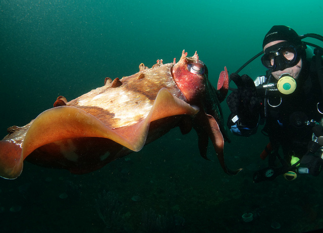 Una seppia gigante schiaccia il cinque ad un sommozzatore. Ripensando a come questi animali si riproducono non penso sia una cosa buona. Immagine John Turnbull