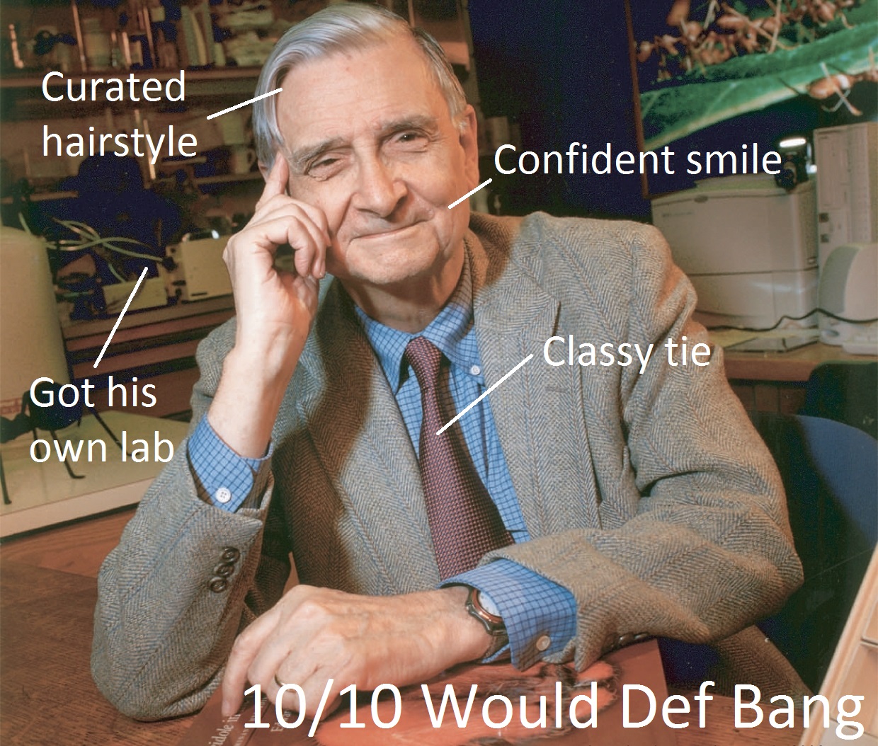 Questo notevole manzo è nient’altri che Edward Osborne Wilson, uno dei più importanti entomologi viventi – per la precisione un mirmecologo, cioè uno studioso di formiche. Vista la natura sociale di questi insetti, l’invenzione da parte di Wilson della disciplina della sociobiologia è stata naturale come l’invenzione della kryptonite da parte di scrittori alle corde che si erano resi conto che rendere il loro eroe invulnerabile avrebbe presto ammazzato la tensione narrativa.