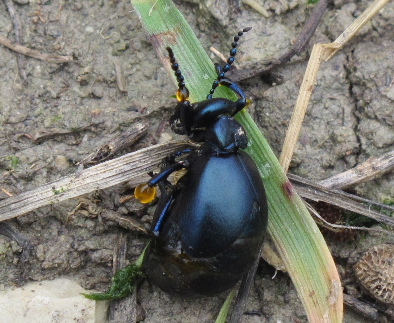 I Meloidae contano circa 3000 specie in tutto il mondo, che nell’ambito dei coleotteri è visto come un numero abbastanza moderato – basti pensare che la famiglia più numerosa, gli Staphylinidae, include al momento un totale di 56.000 specie, cioè più di tutti i vertebrati messi insieme. I Meloidae adulti sono per lo più erbivori, e mostrano una notevole varietà di forme e colori. Molte specie hanno la tendenza ad avere un addome ingrossato; in particolare le specie del genere Meloe, che si può trovare anche in Italia, hanno davvero dei derrière poderosi. Visto che fra ragni e insetti sono le femmine che tendono ad avere il posteriore più abbondante (e giuro che anche da qui sento i miei lettori di sesso maschile mormorare “…e non solo fra ragni e insetti!” mentre lanciano fischi di approvazione e si danno il cinque l’un l’altro), si potrebbe pensare che un Meloe con una tale ipertrofia sia per forza una femmina, ma non lasciatevi ingannare: i maschi hanno addomi quasi altrettanto grandi, e si distinguono invece per la forma delle antenne. Queste sono dette “genicolate” e presentano sezioni a gancio con cui aggrapparsi a quelle della femmina durante l’accoppiamento.