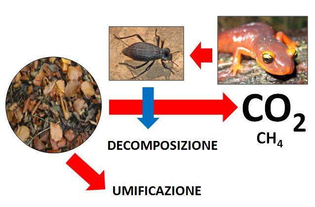 Sono stati fatti esperimenti di esclusione, piazzando sul suolo della foresta piccoli recinti in cui Ensatina non poteva entrare, mentre in altri la salamandra veniva inserita apposta in modo che potesse sbafarsi tutti gli invertebrati che voleva. Ora, chiaramente la grande presenza di invertebrati nei recinti senza salamandre riduce la quantità di materia vegetale morta al suolo. Gli artropodi sgranocchiano le foglie secche come se fossero patatine, e così una parte del carbonio che le componeva viene liberato nell’atmosfera sotto forma di anidride carbonica, un sottoprodotto del metabolismo di tutti gli animali. Inoltre, sminuzzando le foglie gli invertebrati facilitano il processo di decomposizione, che libera ulteriore carbonio sotto forma di anidride carbonica e metano. Che succede invece nei recinti con le salamandre?