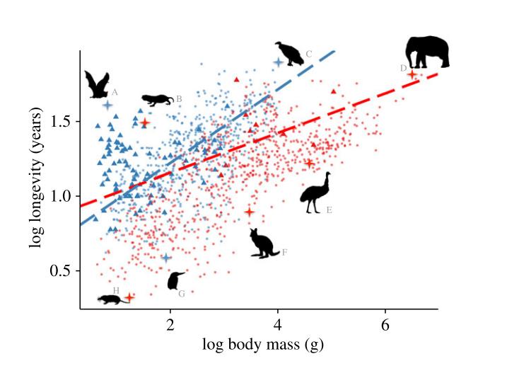 Relazione tra massa corporea e longevità in uccelli e mammiferi. Immagine modificata da Healy et al.2014