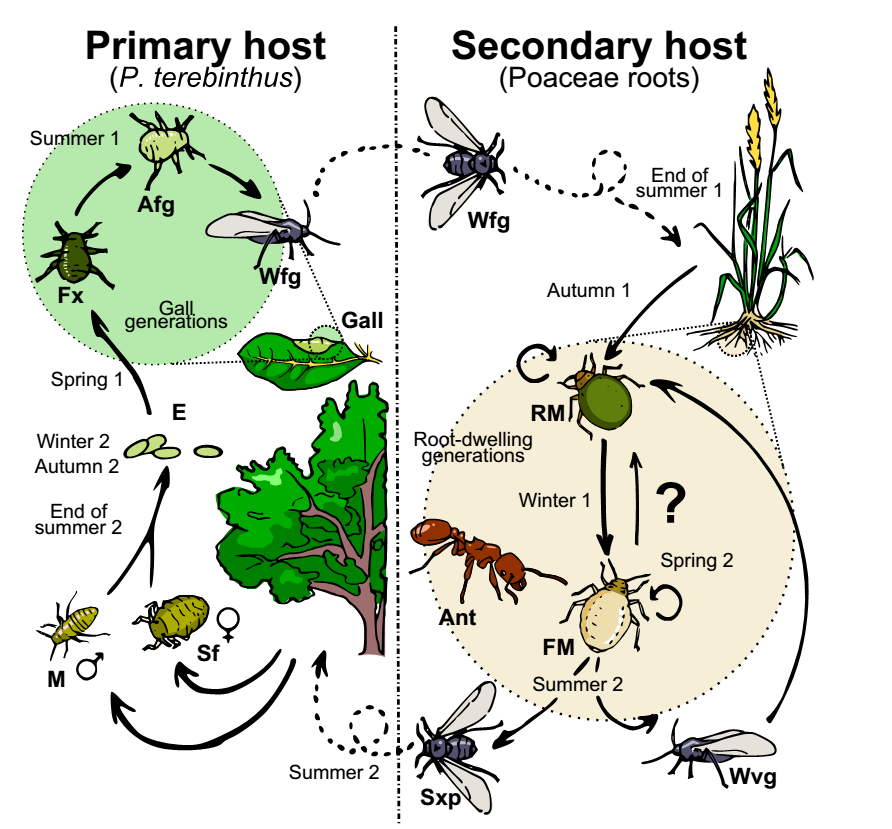 Se zoomiamo ad un determinato periodo della sua vita, quando vive associato alle radici delle piante erbacee, notiamo che P.cimiciformis può assumere due forme ( fenomeno di polimorfismo, occhio a non confonderlo con il suo significato genetico). La cosa strana è che altre specie di afidi strettamente imparentate con P.cimiciformis, in questo periodo della loro vita, ne hanno solo una. Questi due stadi sono entramb caratterizzati dall’assenza di ali e distinguibili soprattutto dalla forma del corpo: una è bianca e piatta, l’altra verde e rotonda. Ciascuna di queste forme è in grado di produrre l’altra per partenogenesi aggiungendo, se possibile, ulteriore caos alla vita di questo minuscolo insetto. Come avrete sicuramente notato dallo schema questa specie di afide ha come amicone Tetramorium semilaeve, una formica abbondante nella penisola iberica. Con lei intrattiene la solita relazione di melata in cambio di protezione, ma con una nuova e inquietante differenza.